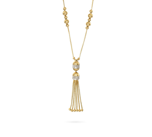 Elegant necklace in 18K yellow gold and white diamonds. This row of endless, diamond-cut spheres gives the piece a soft, distinctive silk-like effect. In the center, two rows of pure...