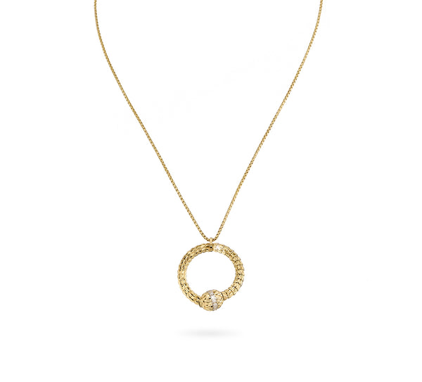 Sinuous and elegant necklace with 18K yellow gold pendant and white diamonds. The Ophidia pendant is made up of a succession of diamond-cut ogives, which together give life to the...